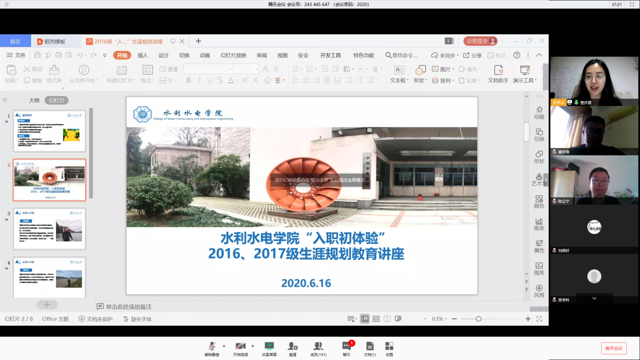6月16日,永利3044noc集团官网举办“入职初体验”生涯规划教育讲座,2016级、2017级全体学生参加讲座。讲座邀请永利3044noc集团官网2017届研究生校友、长江勘测规划设计研究院枢纽院董安雨,2015届本科生校友、广西大藤峡水利枢纽开发有限责任公司工程建设部陈立宁主讲。2016级辅导员笪步源主持讲座。