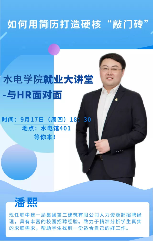 9月17日,为提升永利3044noc集团官网毕业生的就业竞争力,帮助毕业生了解简历制作的知识和技巧,学院举办了“水电就业大讲堂”之与HR面对面系列讲座,邀请中建一局集团第三建筑有限公司人力资源部招聘经理潘熙,以《如何用简历打造硬核“敲门砖”》为题,为毕业生开展了一场既生动又实用的培训。党委副书记王方主持讲座。