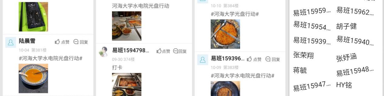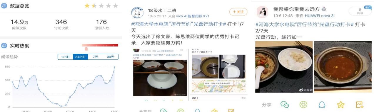 他们光盘宣誓,设计专属光盘打卡脸贴,拒绝“舌尖上的浪费”,呼吁亲朋好友庄严宣誓,做光盘接力者、弘扬者,最终微博和易班平台话题阅读量100000+,参与讨论人数破千。他们除草护粮,走进河海大学节水园区,学习水稻培育知识,除草松土,感悟粮食来之不易。他们旧物传爱,收集全校同学衣物、塑料瓶、纸箱等可回收物品,联系“噢啦”环保公益回收平台进行捐赠,做节约暖心者。他们光盘作画,开展“观我画中意,知我节俭心”光盘艺术家大赛,开拓节约活动中的美育新格局。他们视频传愿,录制Bilibili公益宣传片,自编自排、自导自演,呼唤更多青年勤俭节约的青春力量……