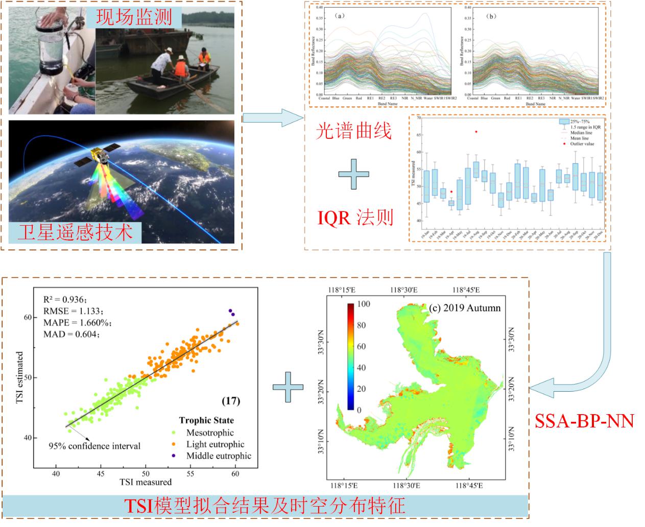 针对全面准确评估复杂环境下的大型湖泊营养状态难题,结合遥感、实测、机器学习、优化算法,创新提出了基于多源信息融合的大型湖泊营养状态遥感评估方法并应用于洪泽湖,为大型湖泊生态系统健康评价提供了关键技术。