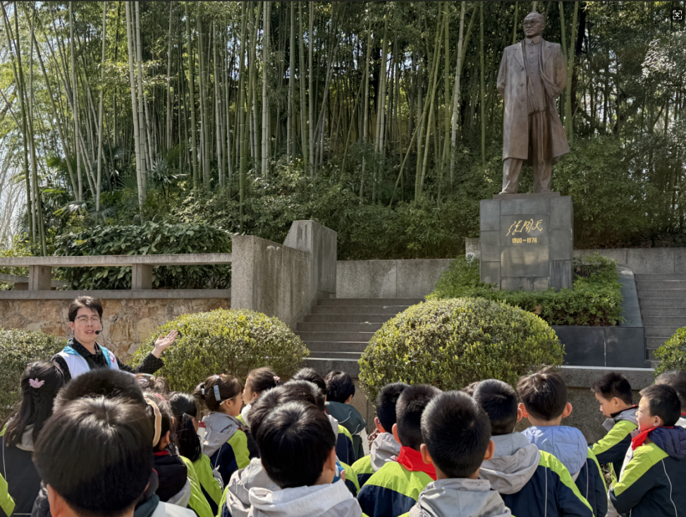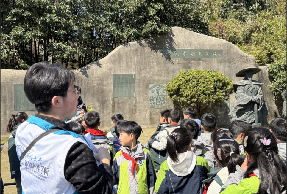 下午1点,参与师生齐聚河海大学1号门,在镌刻“河海大学”的泰山石前合影留念,正式开启探索之旅。在华夏水利先贤广场,讲解员生动讲述了李仪祉、茅以升等水利先贤筚路蓝缕、治水兴水的故事,小朋友们驻足聆听,感受前辈们“水惠民生”的使命担当。