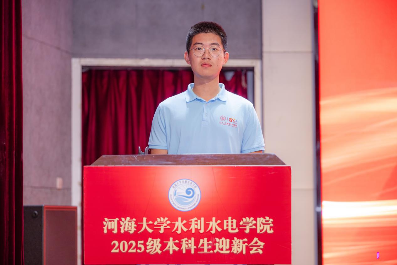 新生代表2025级水利水电工程专业李彦德同学代表全体新生发言,讲述了自己选择河海的历程,围绕大学规划,表达了对未来校园生活的展望。作为建校110周年之际的新生,他表示将与师生共同努力,为河海大学再谱新章。