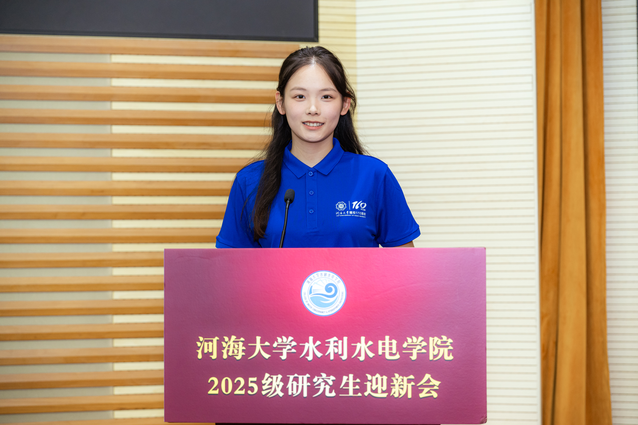 新生代表2025级研究生曹诗佳表达了对研究生生活的期待与憧憬,未来会将个人理想融入水利建设的洪流,用扎实的科研成果为母校献礼,用青春的奋斗为百十河海续写新的荣光。在时代的浪潮中勇立潮头,书写华丽篇章!