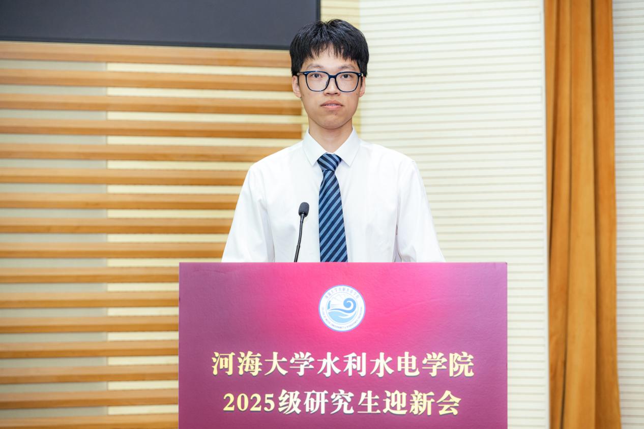 在校生代表2023级研究生钱家豪结合自身经历,分享了从课程学习到科研实践的转变过程,在河海110周年的新起点上,希望新生永葆活力与朝气、锤炼恒心和毅力、涵养责任与担当,向下扎根、向上生长,坚定理想信念,厚植家国情怀,勇担历史使命,奋力书写挺膺担当的青春篇章。