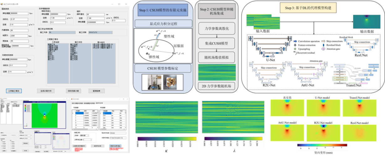 针对设计和施工阶段的隧洞稳定性分析,常规的计算方式难以实现与施工进度相适应的数值模拟,设计了一个集成施工仿真、围岩稳定分析和支护方案优化的平台,有效促进了施工进度信息和数值模型信息的语义交互,为施工方案制定提供支持;针对复杂本构模型的数值计算过程需要消耗大量的时间成本问题,采用基于U-Net架构的深度学习模型构建代理模型。将力学参数和变形场数据转为图像格式输入深度学习模型,实现“物理场”数据的预测,相比于常规的时空序列预测模型,能够提供高效的地层稳定评估解决方案(图2)。