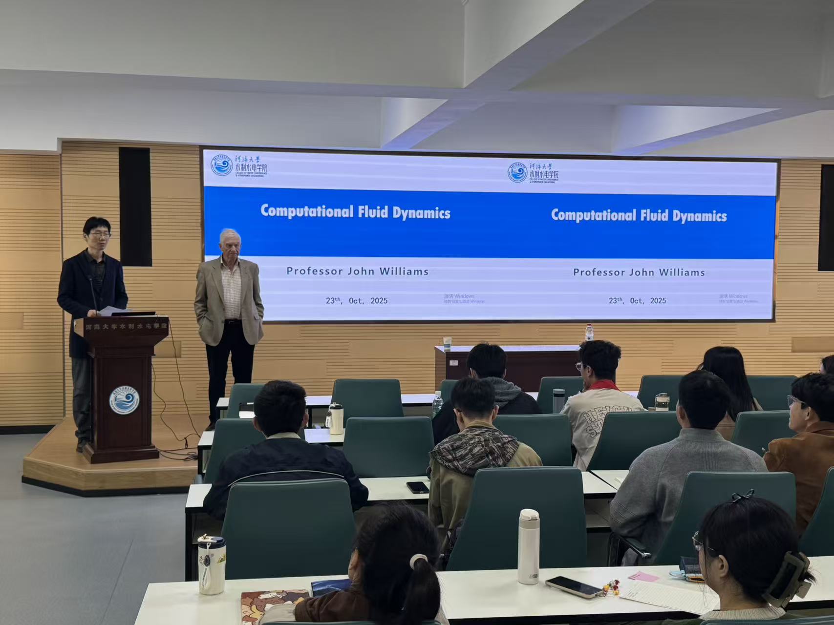 10月23日上午,英国伦敦大学玛丽皇后学院Williams教授应水利部水循环与水动力系统重点实验室邀请访问永利3044noc集团官网,开展系列学术交流。报告会由河海大学永利3044noc集团官网许栋教授主持,永利3044noc集团官网、港口海岸与近海工程学院、海洋学院、力学与材料学院相关老师和学生参加交流。Williams教授应邀做了题目为“Computational Fluid Dynamics: the Basics with Applications”的学术报告。报告会主要介绍了计算流体力学的基本原理,控制方程特征和数值求解方法,受到参会老师和同学的热烈欢迎。