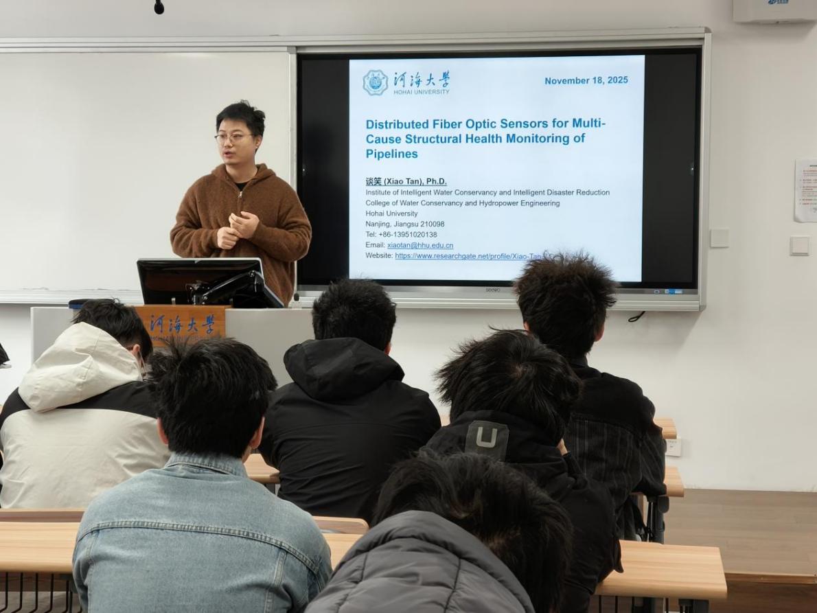 2025年11月18日,永利3044noc集团官网安全工程系副系主任谈笑在常州校区2号楼A207教室主讲《基于分布式光纤传感器技术的管道多因素结构健康监测》专题学术讲座。活动在中国科协大学生科技社团支持计划的支持下开展,旨在搭建学术前沿与专业学习的桥梁,助力学生深化对安全工程领域核心技术的认知,2024级安全工程一班全体同学参加本次讲座。