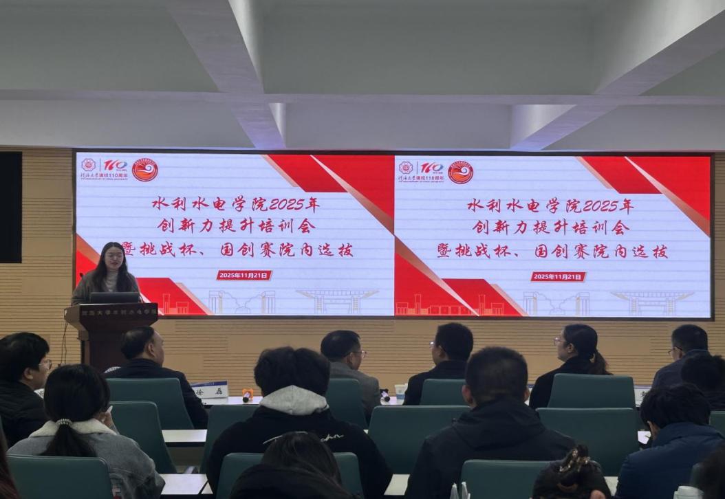为进一步营造学院创新创业氛围,提升学生创新创业实践能力,11月21日,永利3044noc集团官网举办创新力提升培训暨第十五届“挑战杯”中国大学生创业计划竞赛院内选拔赛。双创学院副院长、校团委副书记房阔、永利3044noc集团官网副院长俞晓东、党委副书记戴媛媛、水利水电工程系主任徐磊、商学院袁猛出席并担任评委,学院创新创业导师代表、项目指导老师、备赛团队及团学组织骨干参加,活动由院团委书记笪步源主持。