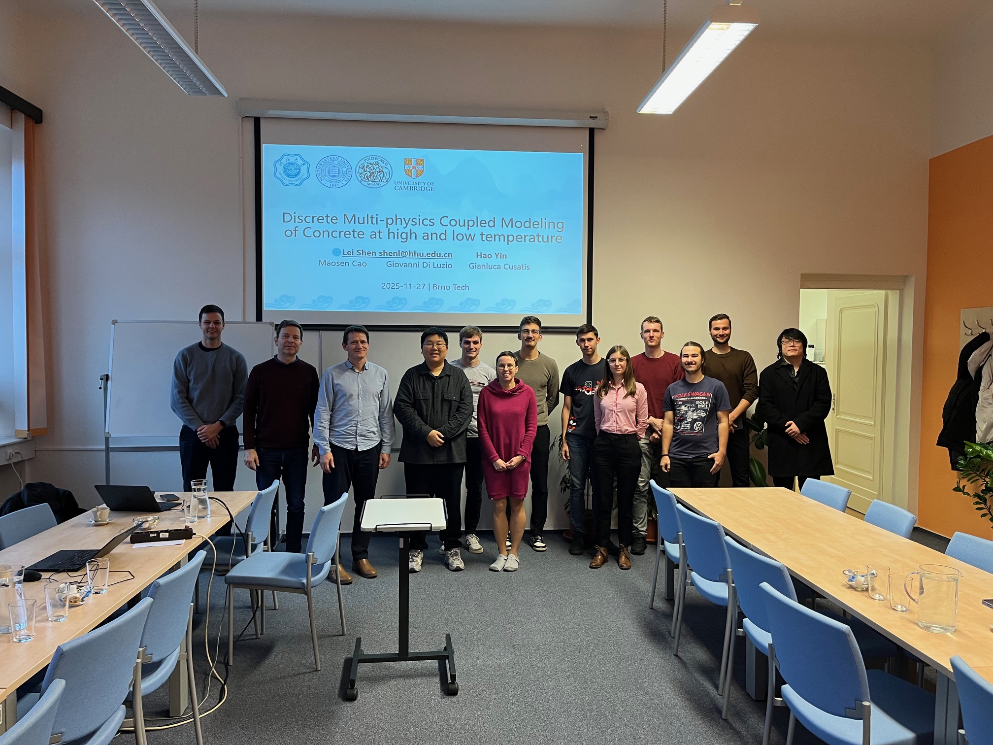 访问期间,沈雷副教授于2025年11月27日(布拉格时间)在布尔诺理工大学土木工程学院作了题为《Discrete Multi-physics Coupled Modeling of Concrete at high and low temperature》的学术报告。报告系统介绍了基于混凝土离散力学本构的多场耦合分析方法,及其在极端高温与低温环境下的工程应用进展。45分钟的汇报吸引了众多师生参与,现场交流热烈,反响积极。