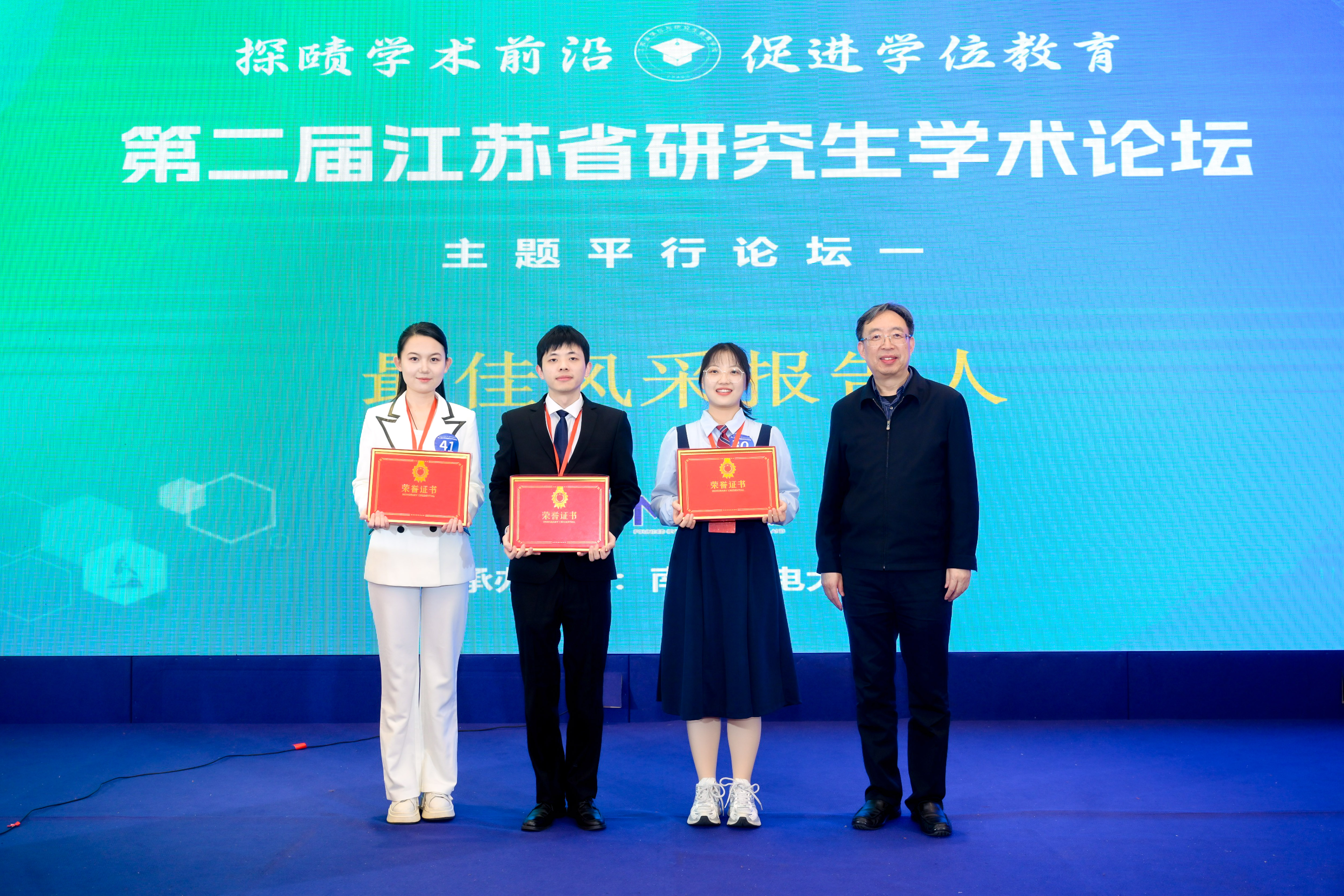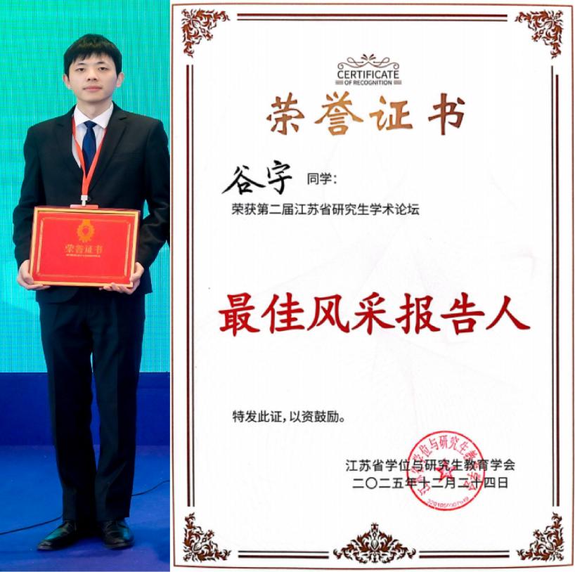 12月24日,第二届江苏省研究生学术论坛在南京成功举办。本届论坛在江苏省教育厅的指导下,由江苏省学位与研究生教育学会主办、南京邮电大学承办,引进了国际学术界通用的“三分钟论文演讲”(3MT)展示模式,强调在极短时间内清晰、生动地阐述科研工作的价值与发现,突出跨学科融合、科研普及与表达能力并重的指导思想。本届论坛由江苏省教育厅原厅长葛道凯、南京邮电大学副校长谢平等多位资深专家担任评委,永利3044noc集团官网谷宇同学代表学校参加论坛并获评“最佳风采报告人”和“优秀学术报告”奖,江苏省教育厅原厅长葛道凯为谷宇同学颁发奖项。