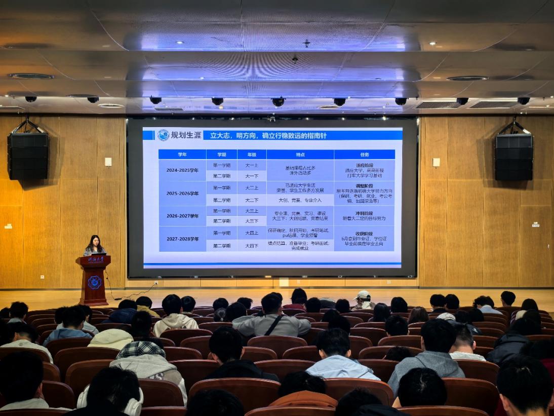 会上,笪老师围绕“复盘学业、规划生涯、价值引领”三个维度,展开系统阐述。她详细拆解了大学四年的核心任务,鼓励同学们一要立大志、明方向,确立行稳致远的指南针。她着重指出大二作为关键转折期,需逐步明确保研、考研、就业等发展方向,积极参与科研创新与学科竞赛,为生涯发展筑牢坚实基础。二要明得失,知差距,增强时不我待的紧迫感。通过详实的学业分析,笪老师引导全体学生要重视课堂学习,养成良好的学习习惯,借助设定目标等方式寻找内驱动力,增强综合技能。三要重学习,强本领,涵养担当时代的精气神。她以“种一棵树最好的时间是10年前,其次是现在”寄语大家,期望大家将个人发展与国家需求紧密结合,鼓励同学们不断提升专业本领、明确发展方向、强化本领担当。